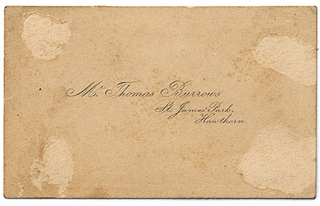 I found a photograph in the State Library of Victoria collection which shows the same house and garden on the banks of the Yarra River around 1880. I looked along the Yarra on the google maps satellite imagery, but couldn’t see Mr Burrows’s villa. I guess it has gone. Thomas Burrows did not make it into the ADB, and some google searching for his name did not find anything relevant. I wonder who he was (apart from being the proud proprietor of this estate), and whether he did use this card as his visiting card. It is certainly not a typical carte-de-visite.