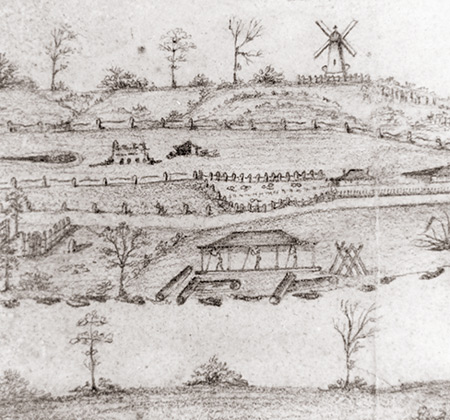 If this photograph of Fairview marks the end of pit-sawing in south east Queensland, the beginning is marked by a small detail in a drawing of the Moreton Bay convict settlement 70 years earlier. We see three convicts working with pit-saws (and three more are out of sight at the bottom of the pit), beside the Brisbane River near the present site of North Quay. Note the logs waiting to be sawn, the stacks of sawn boards, the split post and rail fences, and the windmill at the top of the ridge.