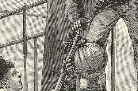The ropes of the twelve bells pass through holes in the ceiling, and reach the floor. Under each is a little raised platform for the ringer to stand on, with a strap for his foot to help him in getting a good purchase and each rope half way up is covered by some four feet by a fluffy, woolly looking covering, technically called a “sally” and intended to afford a good hold to the ringer as he checks his bell in the pull down.—Charles Dickens, All the year round, 27 February 1869. [via].